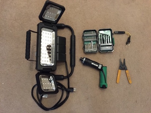 First, I gathered my tools. The tools you need are pretty basic: wire cutter/stripper, circuit tester, battery-powered screwdriver/drill, drill/driver bits. I also used an LED work light and a small step ladder to make life easier.